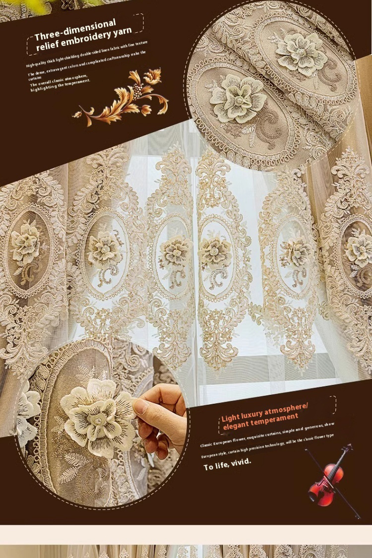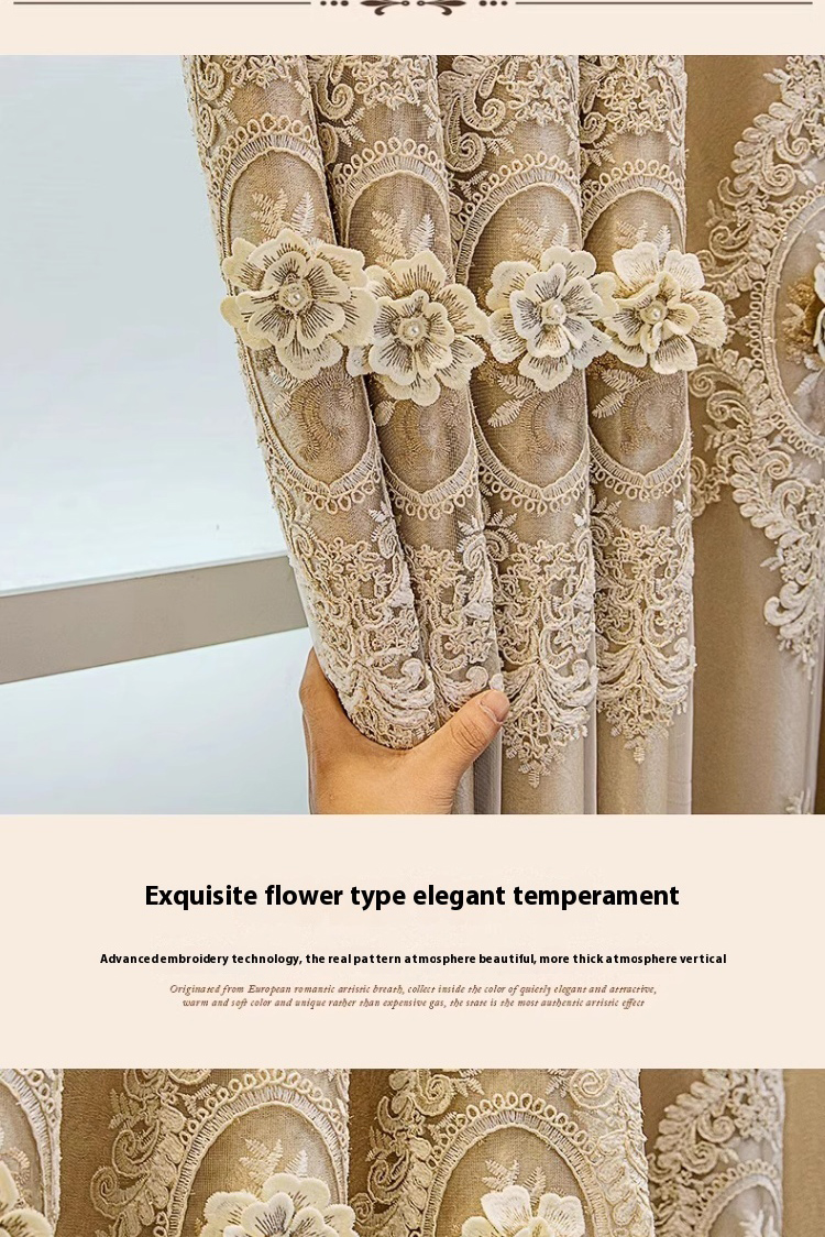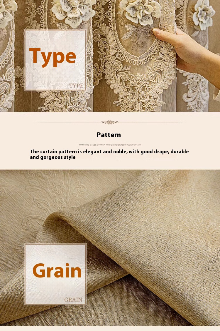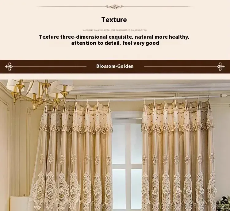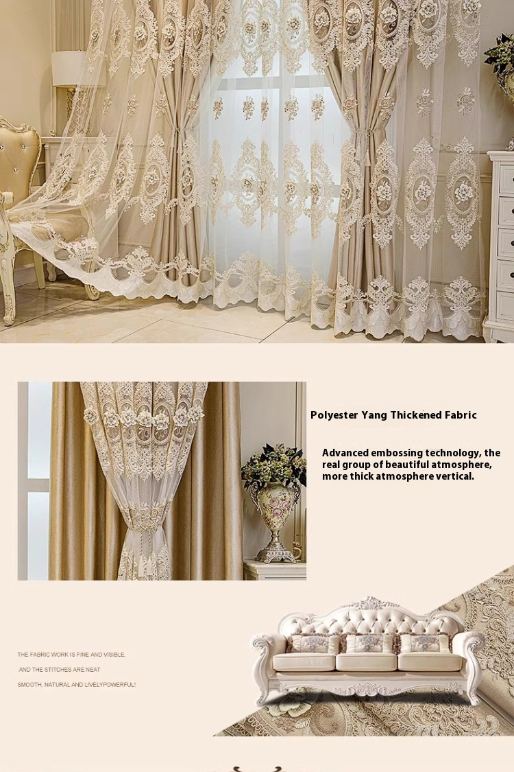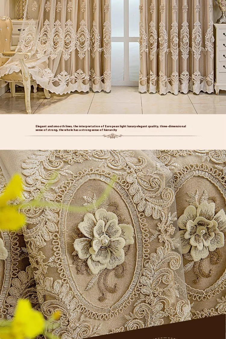 1 gold European style fabric double layered blackout curtain, classic relief embroidery, suitable for bedroom, living room and other room types