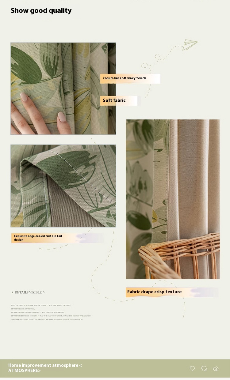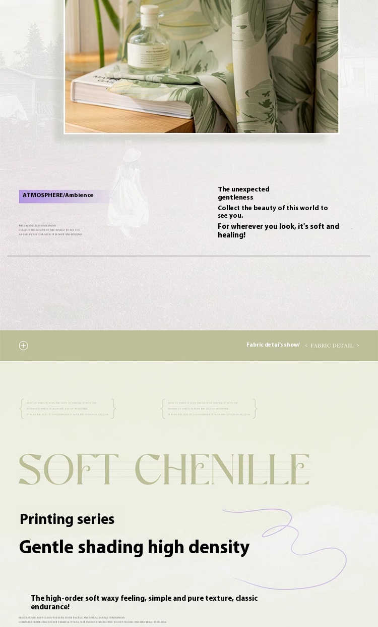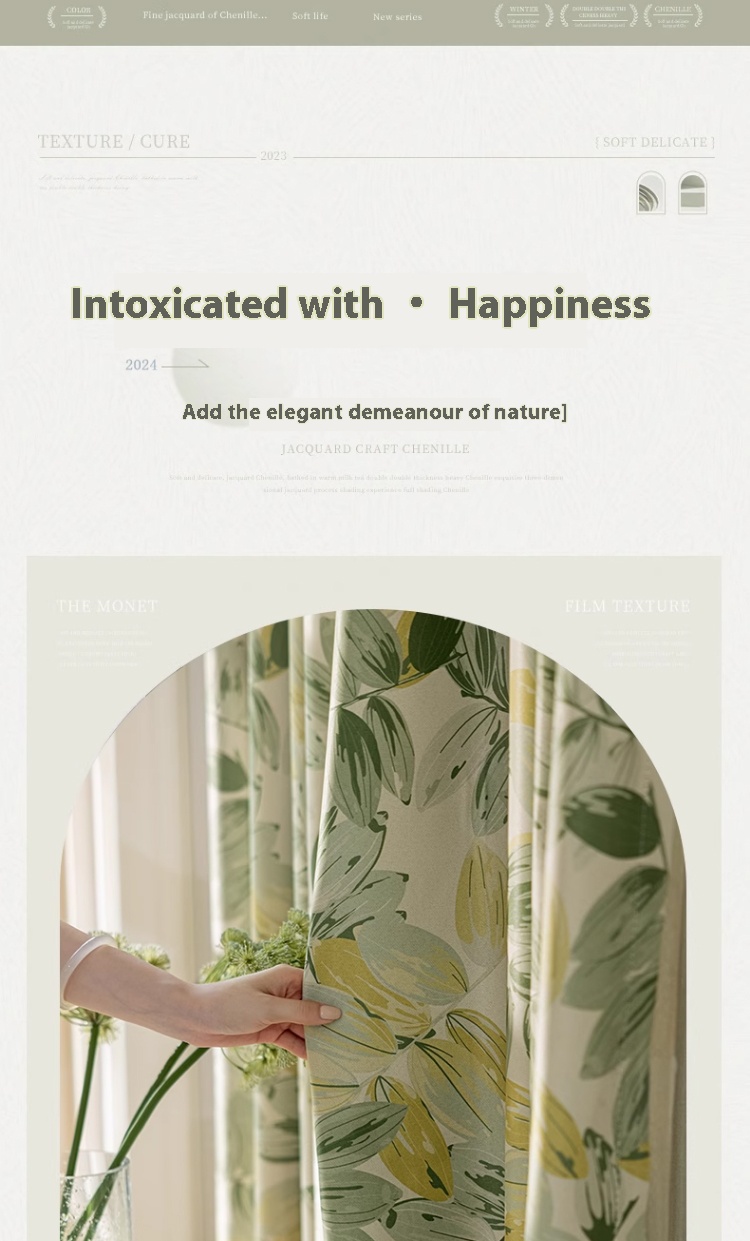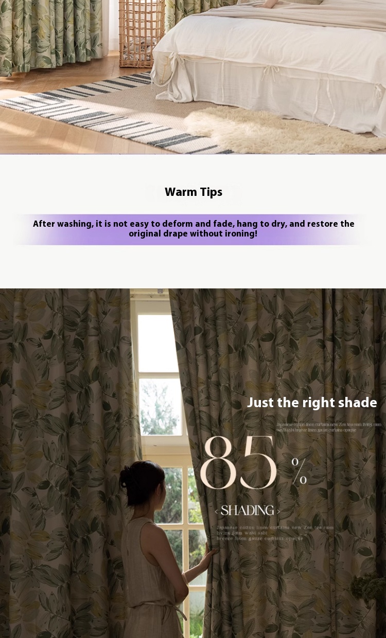1 perforated French green leaf curtain, polyester fiber printed single-sided blackout curtain, suitable for bedroom, living room and other room types