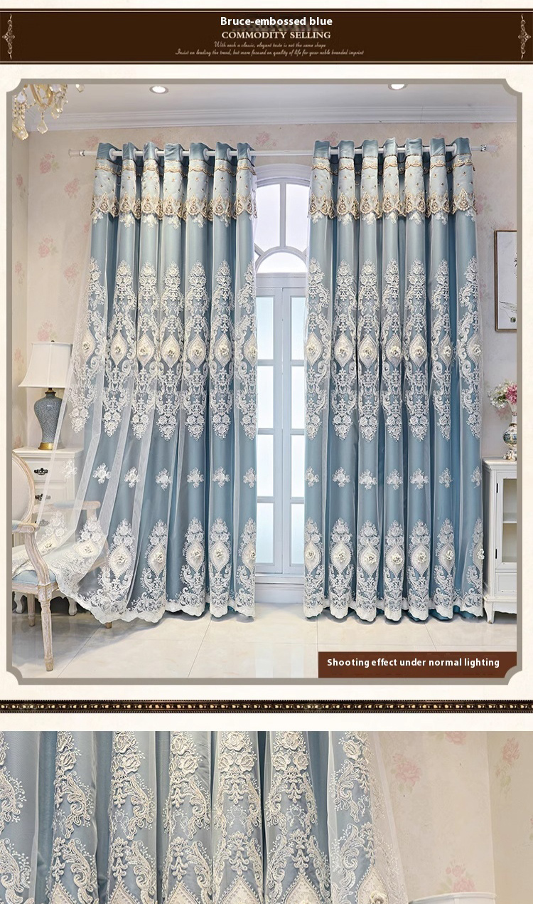 1 piece of blue European style fabric double layered curtain, new high blackout curtain with relief embroidery technology, suitable for various room types such as bedrooms and balconies