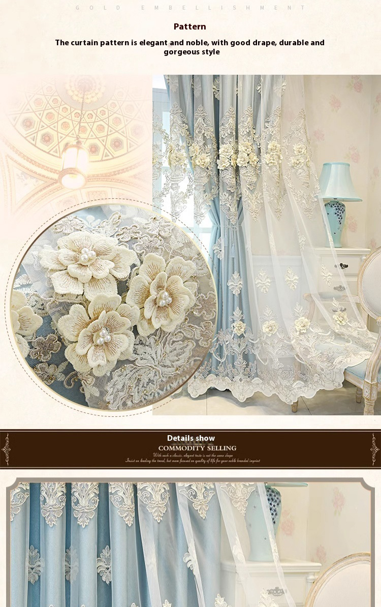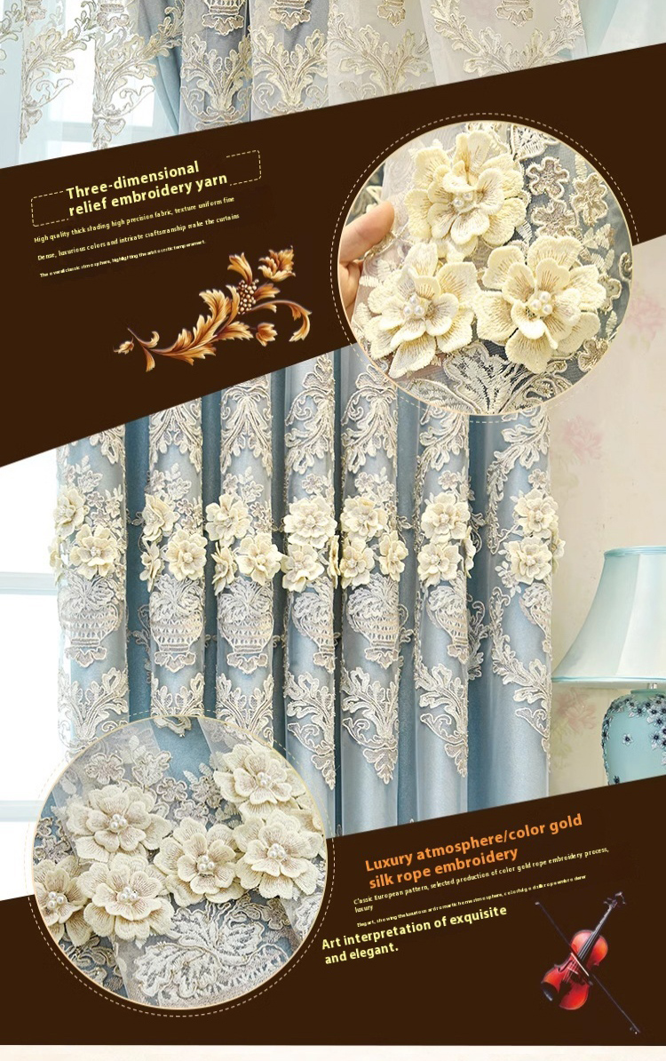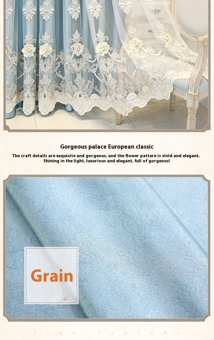 1 piece of European style blue high-end relief embroidered window screen, finished fabric screen integrated, simple living room, bedroom, double-layer blackout curtain